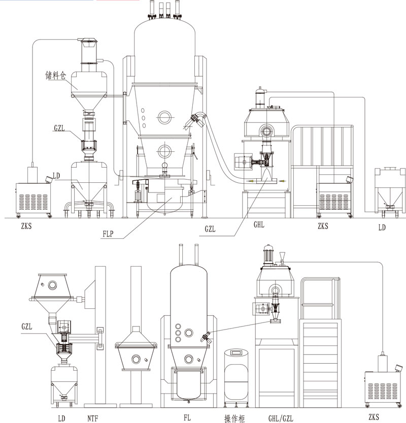 4. The advantages of each equipment of wet granulator and boiling drying granulator are fully embodied.At the same time, the combination of wet granulator and dry granulator and system can ensure a high yield of granulation.5. Vacuum feeding device and sequence lifting device have high automation production conditions. The traditional manual operation is replaced by automation and mechanization production line, which reduces labor intensity and dust pollution.6. Fully automatic in-situ cleaning sprinkler can be set up at multiple points according to user's needs, which ensures CIP in-situ cleaning reliably.
